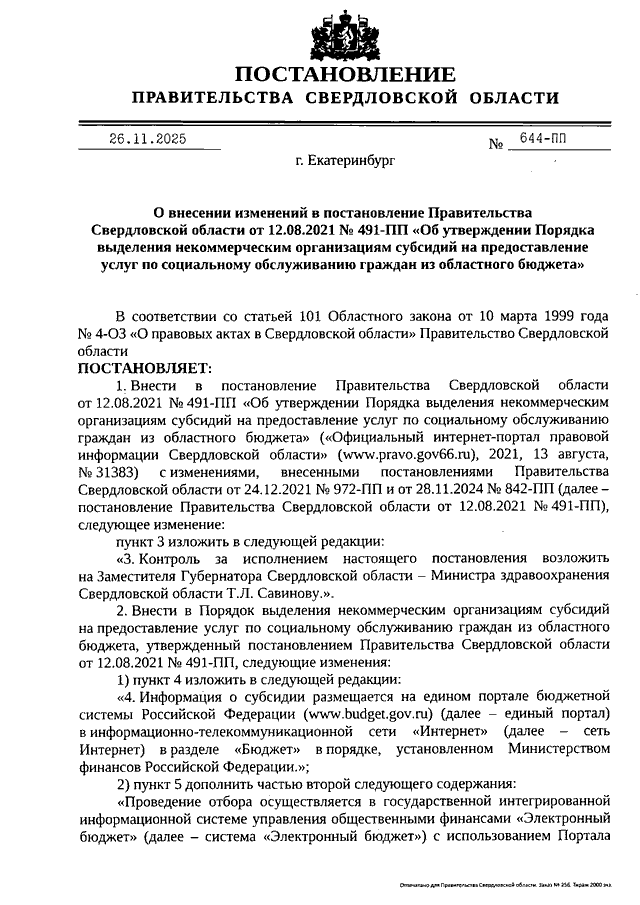 Постановление Правительства Свердловской области от 26.11.2025 N 644-ПП "О внесении изменений в Постановление Правительства Свердловской области от 12.08.2021 N 491-ПП "Об утверждении Порядка выделения некоммерческим организациям субсидий на предоставление услуг по социальному обслуживанию граждан из областного бюджета"