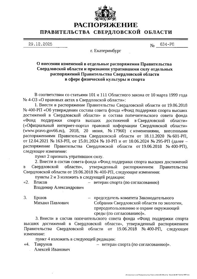 Распоряжение Правительства Свердловской области от 29.12.2025 N 634-РП "О внесении изменений в отдельные распоряжения Правительства Свердловской области и признании утратившими силу отдельных распоряжений Правительства Свердловской области в сфере физической культуры и спорта"