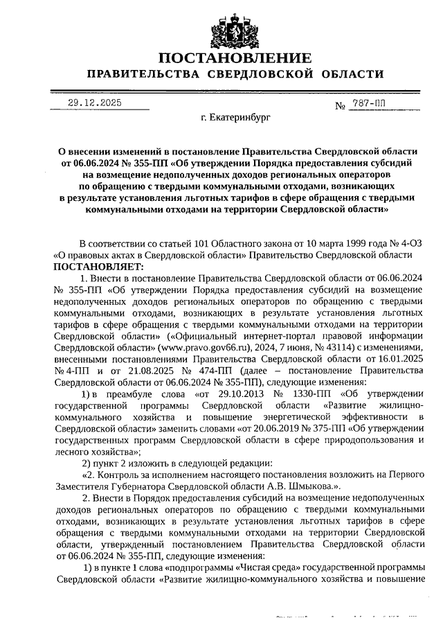Постановление Правительства Свердловской области от 29.12.2025 N 787-ПП "О внесении изменений в Постановление Правительства Свердловской области от 06.06.2024 N 355-ПП "Об утверждении Порядка предоставления субсидий на возмещение недополученных доходов региональных операторов по обращению с твердыми коммунальными отходами, возникающих в результате установления льготных тарифов в сфере обращения с твердыми коммунальными отходами на территории Свердловской области"