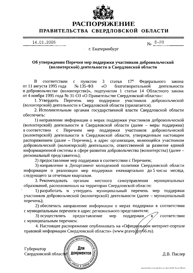 Распоряжение Правительства Свердловской области от 14.01.2026 N 8-РП "Об утверждении Перечня мер поддержки участников добровольческой (волонтерской) деятельности в Свердловской области"