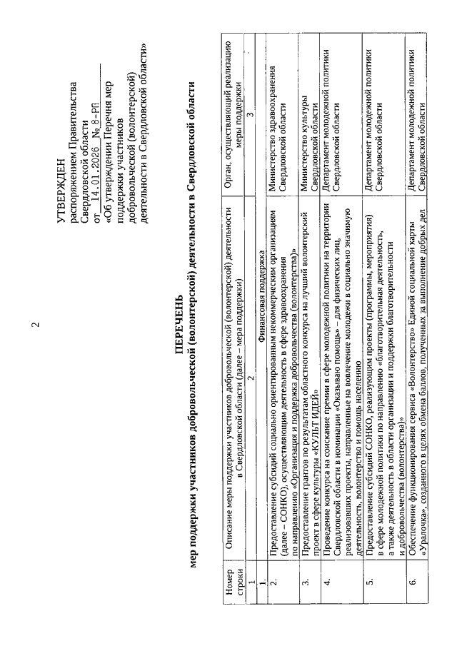 Распоряжение Правительства Свердловской области от 14.01.2026 N 8-РП "Об утверждении Перечня мер поддержки участников добровольческой (волонтерской) деятельности в Свердловской области"