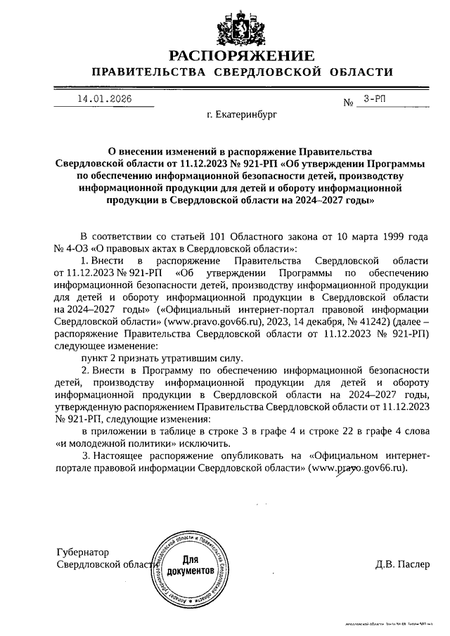 Распоряжение Правительства Свердловской области от 14.01.2026 N 3-РП "О внесении изменений в Распоряжение Правительства Свердловской области от 11.12.2023 N 921-РП "Об утверждении Программы по обеспечению информационной безопасности детей, производству информационной продукции для детей и обороту информационной продукции в Свердловской области на 2024 - 2027 годы"