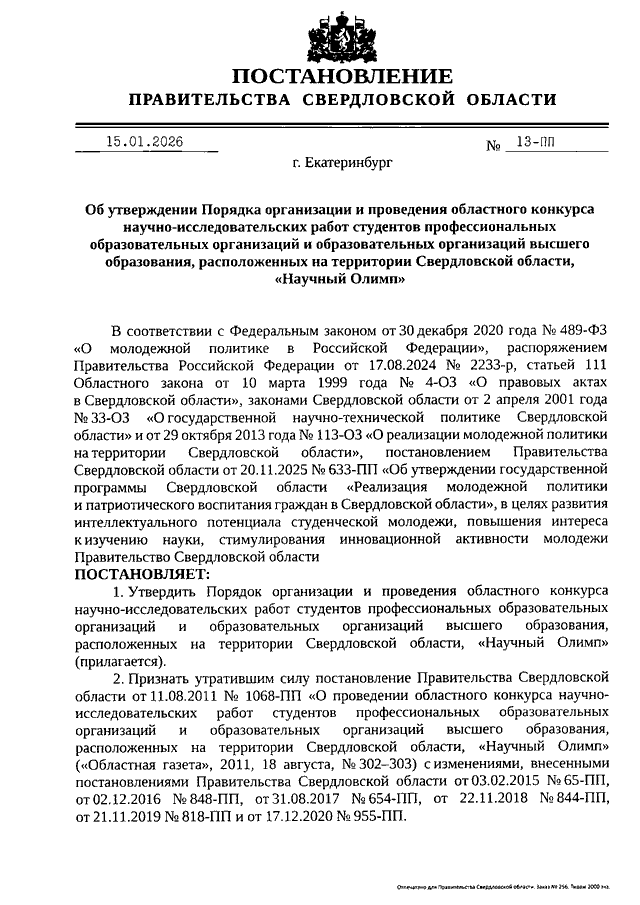 Постановление Правительства Свердловской области от 15.01.2026 N 13-ПП "Об утверждении Порядка организации и проведения областного конкурса научно-исследовательских работ студентов профессиональных образовательных организаций и образовательных организаций высшего образования, расположенных на территории Свердловской области, "Научный Олимп"
