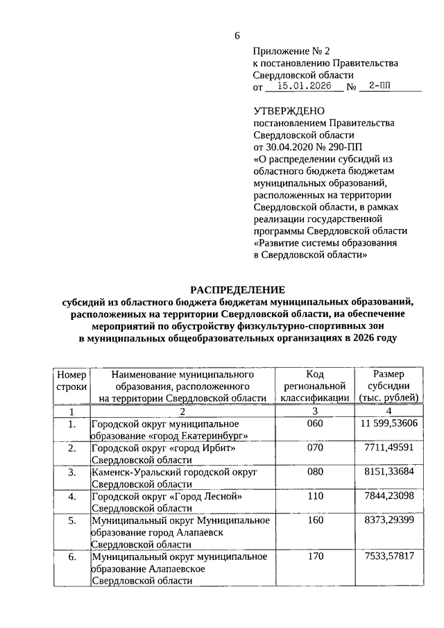 Постановление Правительства Свердловской области от 15.01.2026 N 2-ПП "О внесении изменений в Постановление Правительства Свердловской области от 30.04.2020 N 290-ПП "О распределении субсидий из областного бюджета бюджетам муниципальных образований, расположенных на территории Свердловской области, в рамках реализации государственной программы Свердловской области "Развитие системы образования в Свердловской области"
