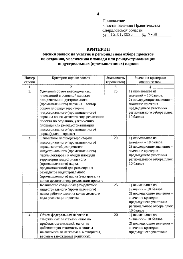 Постановление Правительства Свердловской области от 15.01.2026 N 7-ПП "О внесении изменений в Постановление Правительства Свердловской области от 03.10.2024 N 697-ПП "О проведении регионального отбора проектов по созданию, увеличению площади или реиндустриализации индустриальных (промышленных) парков"