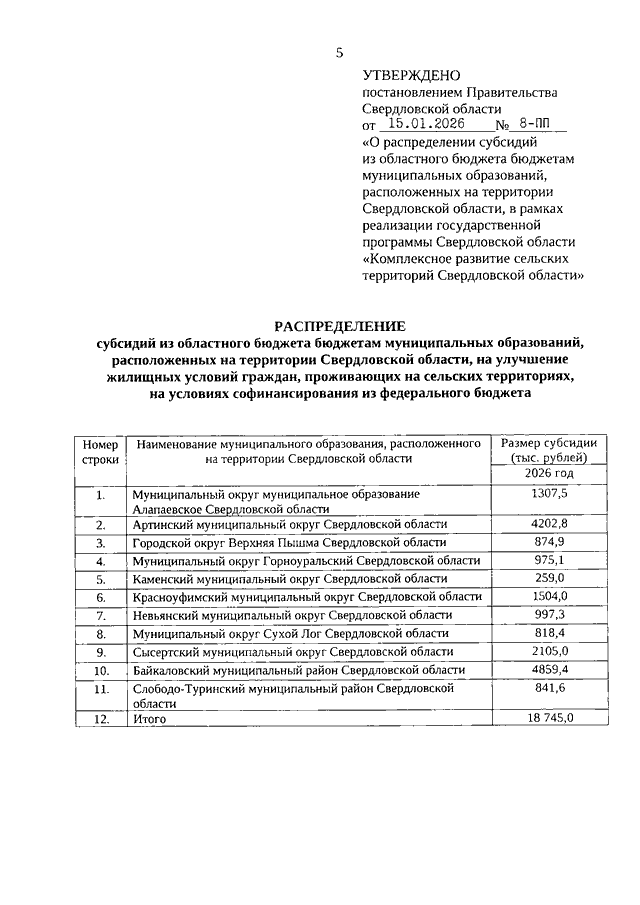 Постановление Правительства Свердловской области от 15.01.2026 N 8-ПП "О распределении субсидий из областного бюджета бюджетам муниципальных образований, расположенных на территории Свердловской области, в рамках реализации государственной программы Свердловской области "Комплексное развитие сельских территорий Свердловской области"