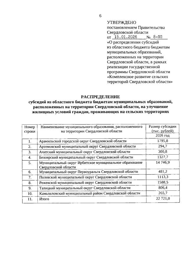 Постановление Правительства Свердловской области от 15.01.2026 N 8-ПП "О распределении субсидий из областного бюджета бюджетам муниципальных образований, расположенных на территории Свердловской области, в рамках реализации государственной программы Свердловской области "Комплексное развитие сельских территорий Свердловской области"