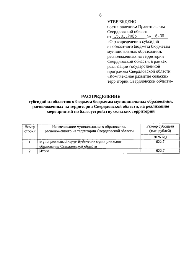 Постановление Правительства Свердловской области от 15.01.2026 N 8-ПП "О распределении субсидий из областного бюджета бюджетам муниципальных образований, расположенных на территории Свердловской области, в рамках реализации государственной программы Свердловской области "Комплексное развитие сельских территорий Свердловской области"
