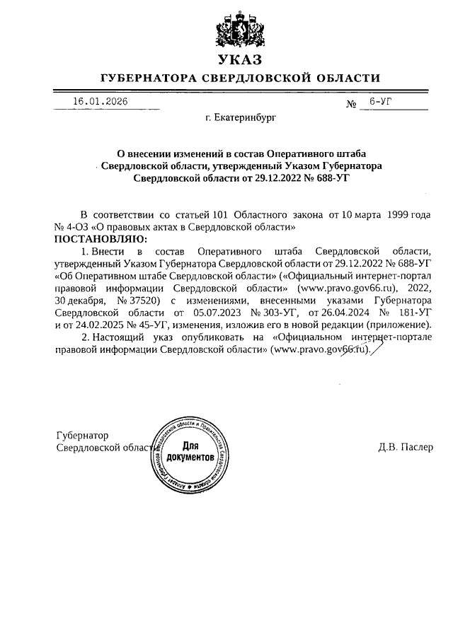 Указ Губернатора Свердловской области от 16.01.2026 N 6-УГ "О внесении изменений в состав Оперативного штаба Свердловской области, утвержденный Указом Губернатора Свердловской области от 29.12.2022 N 688-УГ"