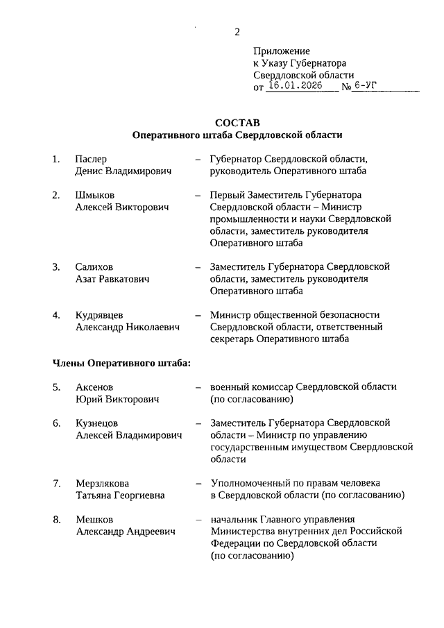 Указ Губернатора Свердловской области от 16.01.2026 N 6-УГ "О внесении изменений в состав Оперативного штаба Свердловской области, утвержденный Указом Губернатора Свердловской области от 29.12.2022 N 688-УГ"