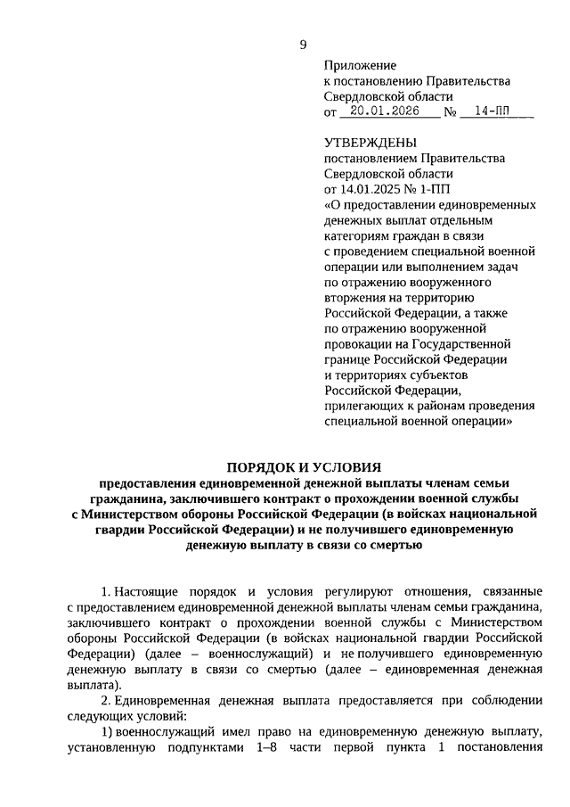 Постановление Правительства Свердловской области от 20.01.2026 N 14-ПП "О внесении изменений в отдельные правовые акты Правительства Свердловской области, регулирующие отношения, связанные с предоставлением мер социальной поддержки отдельным категориям граждан в связи с проведением специальной военной операции"