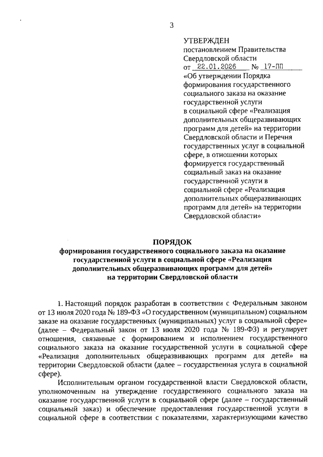 Постановление Правительства Свердловской области от 22.01.2026 N 17-ПП "Об утверждении Порядка формирования государственного социального заказа на оказание государственной услуги в социальной сфере "Реализация дополнительных общеразвивающих программ для детей" на территории Свердловской области и Перечня государственных услуг в социальной сфере, в отношении которых формируется государственный социальный заказ на оказание государственной услуги в социальной сфере "Реализация дополнительных общеразвивающих программ для детей" на территории Свердловской области"