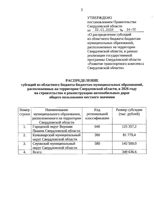 Постановление Правительства Свердловской области от 22.01.2026 N 24-ПП "О распределении субсидий из областного бюджета бюджетам муниципальных образований, расположенных на территории Свердловской области, в рамках реализации государственной программы Свердловской области "Развитие транспортного комплекса Свердловской области"
