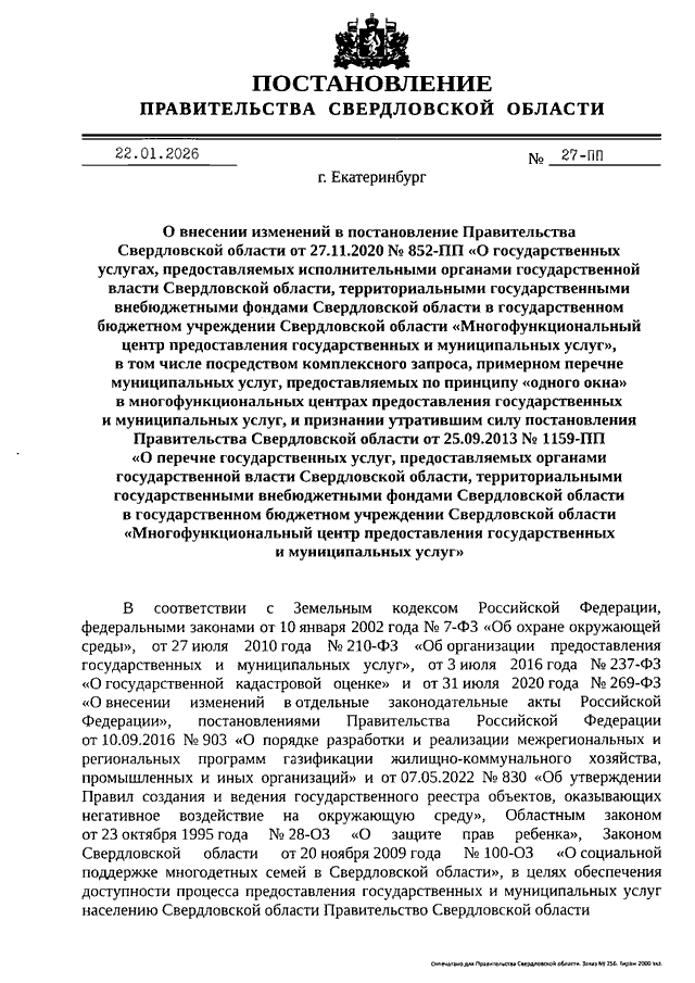 Постановление Правительства Свердловской области от 22.01.2026 N 27-ПП "О внесении изменений в Постановление Правительства Свердловской области от 27.11.2020 N 852-ПП "О государственных услугах, предоставляемых исполнительными органами государственной власти Свердловской области, территориальными государственными внебюджетными фондами Свердловской области в государственном бюджетном учреждении Свердловской области "Многофункциональный центр предоставления государственных и муниципальных услуг", в том числе посредством комплексного запроса, примерном перечне муниципальных услуг, предоставляемых по принципу "одного окна" в многофункциональных центрах предоставления государственных и муниципальных услуг, и признании утратившим силу Постановления Правительства Свердловской области от 25.09.2013 N 1159-ПП "О перечне государственных услуг, предоставляемых органами государственной власти Свердловской области, территориальными государственными внебюджетными фондами Свердловской области в государственном бюджетном учреждении Свердловской области "Многофункциональный центр предоставления государственных и муниципальных услуг"