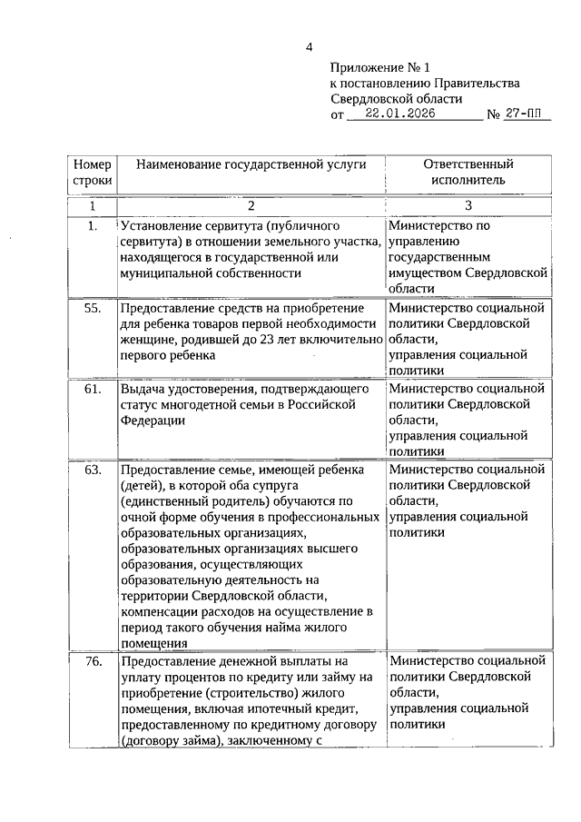 Постановление Правительства Свердловской области от 22.01.2026 N 27-ПП "О внесении изменений в Постановление Правительства Свердловской области от 27.11.2020 N 852-ПП "О государственных услугах, предоставляемых исполнительными органами государственной власти Свердловской области, территориальными государственными внебюджетными фондами Свердловской области в государственном бюджетном учреждении Свердловской области "Многофункциональный центр предоставления государственных и муниципальных услуг", в том числе посредством комплексного запроса, примерном перечне муниципальных услуг, предоставляемых по принципу "одного окна" в многофункциональных центрах предоставления государственных и муниципальных услуг, и признании утратившим силу Постановления Правительства Свердловской области от 25.09.2013 N 1159-ПП "О перечне государственных услуг, предоставляемых органами государственной власти Свердловской области, территориальными государственными внебюджетными фондами Свердловской области в государственном бюджетном учреждении Свердловской области "Многофункциональный центр предоставления государственных и муниципальных услуг"