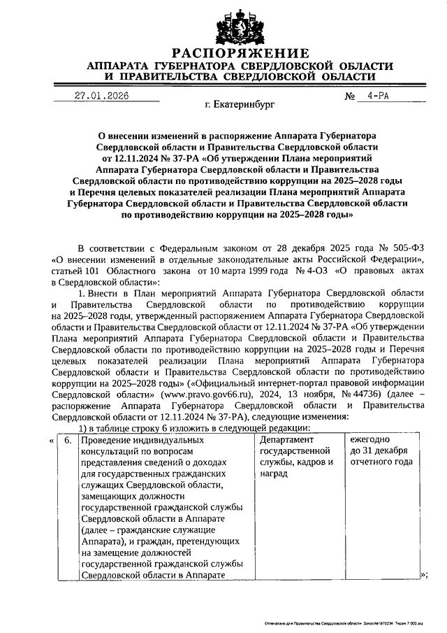 Распоряжение Аппарата Губернатора Свердловской области и Правительства Свердловской области от 27.01.2026 N 4-РА "О внесении изменений в Распоряжение Аппарата Губернатора Свердловской области и Правительства Свердловской области от 12.11.2024 N 37-РА "Об утверждении Плана мероприятий Аппарата Губернатора Свердловской области и Правительства Свердловской области по противодействию коррупции на 2025 - 2028 годы и Перечня целевых показателей реализации Плана мероприятий Аппарата Губернатора Свердловской области и Правительства Свердловской области по противодействию коррупции на 2025 - 2028 годы"