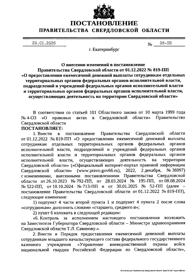 Постановление Правительства Свердловской области от 29.01.2026 N 38-ПП "О внесении изменений в Постановление Правительства Свердловской области от 01.12.2022 N 819-ПП "О предоставлении ежемесячной денежной выплаты сотрудникам отдельных территориальных органов федеральных органов исполнительной власти, подразделений и учреждений федеральных органов исполнительной власти и территориальных органов федеральных органов исполнительной власти, осуществляющих деятельность на территории Свердловской области"