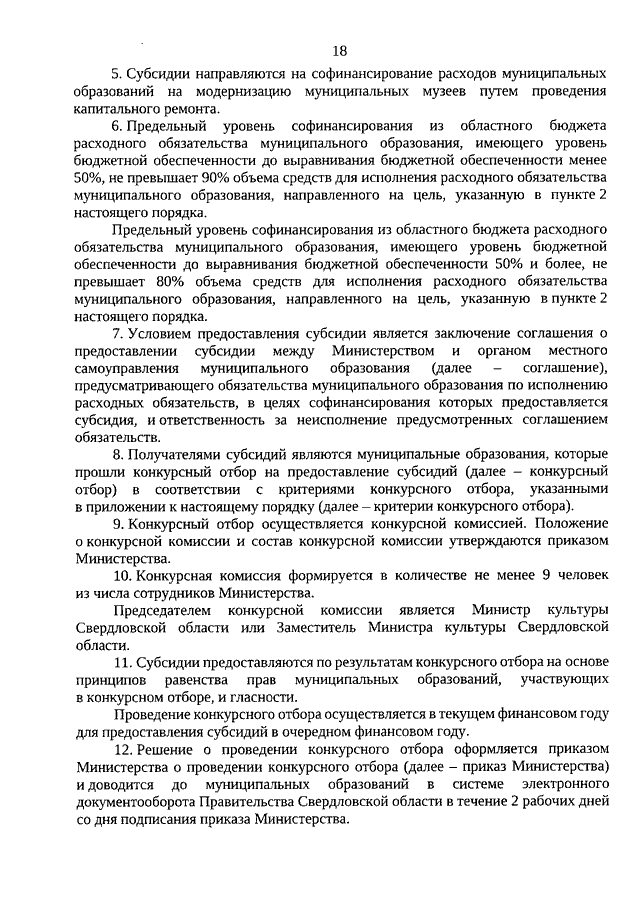 Постановление Правительства Свердловской области от 29.01.2026 N 46-ПП "Об утверждении порядков предоставления и распределения отдельных субсидий из областного бюджета бюджетам муниципальных образований, расположенных на территории Свердловской области, в сфере культуры" (вместе с "Порядком предоставления и распределения субсидий из областного бюджета бюджетам муниципальных образований, расположенных на территории Свердловской области, на ремонт и (или) материально-техническое оснащение филармоний на условиях софинансирования из федерального бюджета", "Порядком предоставления и распределения субсидий из областного бюджета бюджетам муниципальных образований, расположенных на территории Свердловской области, на модернизацию музеев на условиях софинансирования из федерального бюджета", "Порядком предоставления и распределения субсидий из областного бюджета бюджетам муниципальных образований, расположенных на территории Свердловской области, на модернизацию учреждений культурно-досугового типа в населенных пунктах с численностью до 500 тысяч человек на условиях софинансирования из федерального бюджета", "Порядком предоставления и распределения субсидий из областного бюджета бюджетам муниципальных образований, расположенных на территории Свердловской области, на создание детских культурно-просветительских центров на базе учреждений культуры на условиях софинансирования из федерального бюджета", "Порядком предоставления и распределения субсидий из областного бюджета бюджетам муниципальных образований, расположенных на территории Свердловской области, по итогам проведения ежегодного Всероссийского конкурса среди библиотек для выявления лучших практик их работы на условиях софинансирования из федерального бюджета", "Порядком предоставления и распределения субсидий из областного бюджета бюджетам муниципальных образований, расположенных на территории Свердловской области, по итогам проведения ежегодного Всероссийского конкурса среди домов культуры для выявления лучших практик их работы на условиях софинансирования из федерального бюджета", "Порядком предоставления субсидии из областного бюджета бюджету Городского округа "город Ирбит" Свердловской области на завершение работ по сохранению объекта культурного наследия регионального значения "Здание драматического театра им. А.Н. Островского")