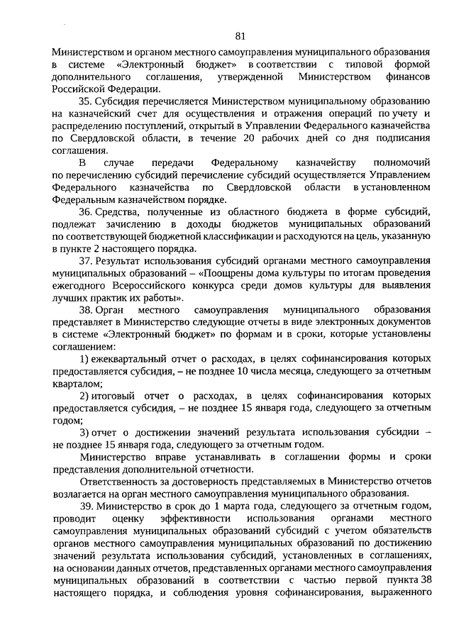 Постановление Правительства Свердловской области от 29.01.2026 N 46-ПП "Об утверждении порядков предоставления и распределения отдельных субсидий из областного бюджета бюджетам муниципальных образований, расположенных на территории Свердловской области, в сфере культуры" (вместе с "Порядком предоставления и распределения субсидий из областного бюджета бюджетам муниципальных образований, расположенных на территории Свердловской области, на ремонт и (или) материально-техническое оснащение филармоний на условиях софинансирования из федерального бюджета", "Порядком предоставления и распределения субсидий из областного бюджета бюджетам муниципальных образований, расположенных на территории Свердловской области, на модернизацию музеев на условиях софинансирования из федерального бюджета", "Порядком предоставления и распределения субсидий из областного бюджета бюджетам муниципальных образований, расположенных на территории Свердловской области, на модернизацию учреждений культурно-досугового типа в населенных пунктах с численностью до 500 тысяч человек на условиях софинансирования из федерального бюджета", "Порядком предоставления и распределения субсидий из областного бюджета бюджетам муниципальных образований, расположенных на территории Свердловской области, на создание детских культурно-просветительских центров на базе учреждений культуры на условиях софинансирования из федерального бюджета", "Порядком предоставления и распределения субсидий из областного бюджета бюджетам муниципальных образований, расположенных на территории Свердловской области, по итогам проведения ежегодного Всероссийского конкурса среди библиотек для выявления лучших практик их работы на условиях софинансирования из федерального бюджета", "Порядком предоставления и распределения субсидий из областного бюджета бюджетам муниципальных образований, расположенных на территории Свердловской области, по итогам проведения ежегодного Всероссийского конкурса среди домов культуры для выявления лучших практик их работы на условиях софинансирования из федерального бюджета", "Порядком предоставления субсидии из областного бюджета бюджету Городского округа "город Ирбит" Свердловской области на завершение работ по сохранению объекта культурного наследия регионального значения "Здание драматического театра им. А.Н. Островского")