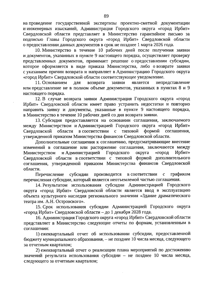 Постановление Правительства Свердловской области от 29.01.2026 N 46-ПП "Об утверждении порядков предоставления и распределения отдельных субсидий из областного бюджета бюджетам муниципальных образований, расположенных на территории Свердловской области, в сфере культуры" (вместе с "Порядком предоставления и распределения субсидий из областного бюджета бюджетам муниципальных образований, расположенных на территории Свердловской области, на ремонт и (или) материально-техническое оснащение филармоний на условиях софинансирования из федерального бюджета", "Порядком предоставления и распределения субсидий из областного бюджета бюджетам муниципальных образований, расположенных на территории Свердловской области, на модернизацию музеев на условиях софинансирования из федерального бюджета", "Порядком предоставления и распределения субсидий из областного бюджета бюджетам муниципальных образований, расположенных на территории Свердловской области, на модернизацию учреждений культурно-досугового типа в населенных пунктах с численностью до 500 тысяч человек на условиях софинансирования из федерального бюджета", "Порядком предоставления и распределения субсидий из областного бюджета бюджетам муниципальных образований, расположенных на территории Свердловской области, на создание детских культурно-просветительских центров на базе учреждений культуры на условиях софинансирования из федерального бюджета", "Порядком предоставления и распределения субсидий из областного бюджета бюджетам муниципальных образований, расположенных на территории Свердловской области, по итогам проведения ежегодного Всероссийского конкурса среди библиотек для выявления лучших практик их работы на условиях софинансирования из федерального бюджета", "Порядком предоставления и распределения субсидий из областного бюджета бюджетам муниципальных образований, расположенных на территории Свердловской области, по итогам проведения ежегодного Всероссийского конкурса среди домов культуры для выявления лучших практик их работы на условиях софинансирования из федерального бюджета", "Порядком предоставления субсидии из областного бюджета бюджету Городского округа "город Ирбит" Свердловской области на завершение работ по сохранению объекта культурного наследия регионального значения "Здание драматического театра им. А.Н. Островского")