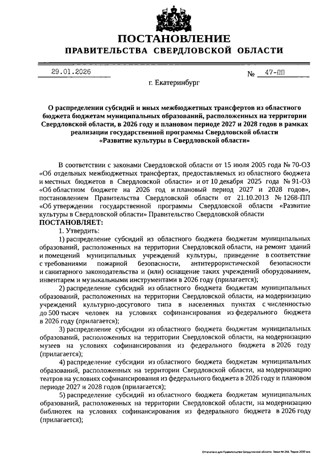 Постановление Правительства Свердловской области от 29.01.2026 N 47-ПП "О распределении субсидий и иных межбюджетных трансфертов из областного бюджета бюджетам муниципальных образований, расположенных на территории Свердловской области, в 2026 году и плановом периоде 2027 и 2028 годов в рамках реализации государственной программы Свердловской области "Развитие культуры в Свердловской области"