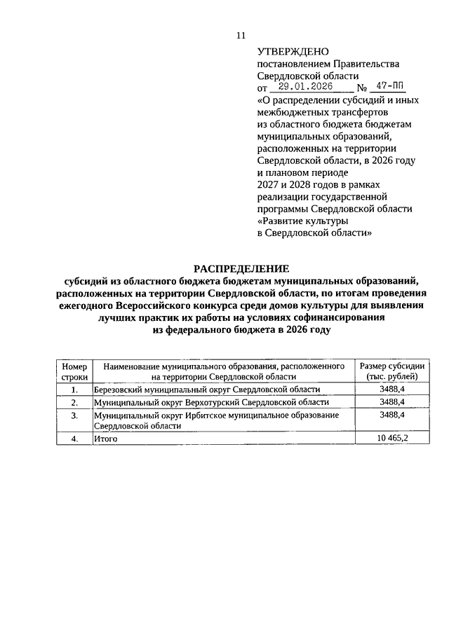 Постановление Правительства Свердловской области от 29.01.2026 N 47-ПП "О распределении субсидий и иных межбюджетных трансфертов из областного бюджета бюджетам муниципальных образований, расположенных на территории Свердловской области, в 2026 году и плановом периоде 2027 и 2028 годов в рамках реализации государственной программы Свердловской области "Развитие культуры в Свердловской области"