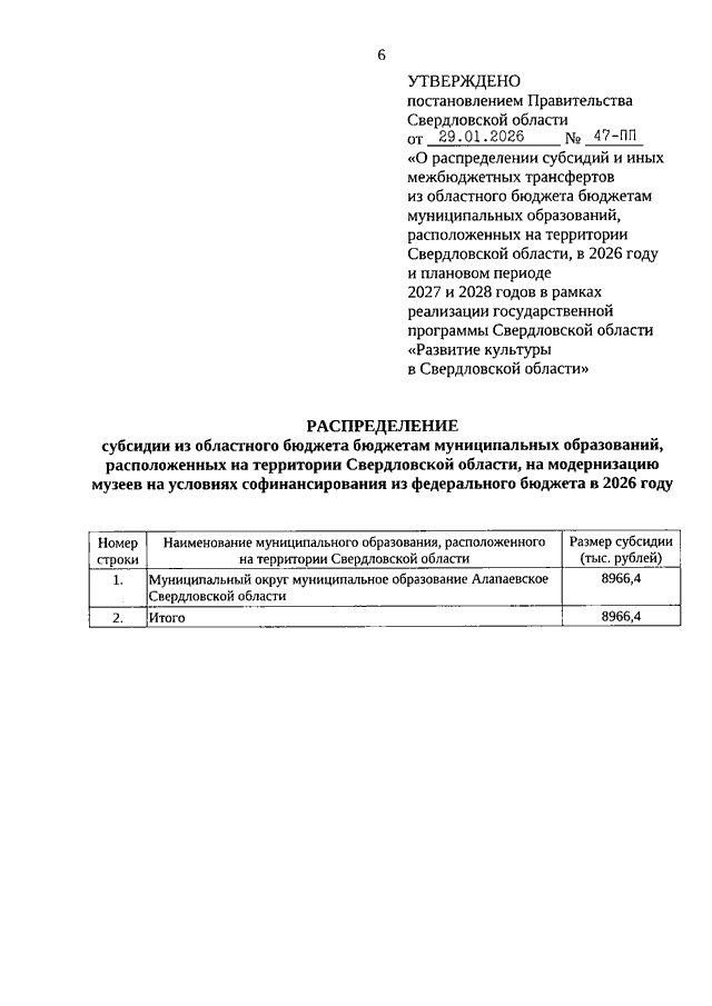 Постановление Правительства Свердловской области от 29.01.2026 N 47-ПП "О распределении субсидий и иных межбюджетных трансфертов из областного бюджета бюджетам муниципальных образований, расположенных на территории Свердловской области, в 2026 году и плановом периоде 2027 и 2028 годов в рамках реализации государственной программы Свердловской области "Развитие культуры в Свердловской области"