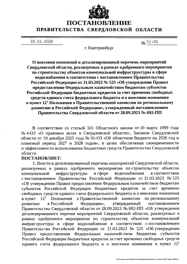 Постановление Правительства Свердловской области от 29.01.2026 N 51-ПП "О внесении изменений в детализированный перечень мероприятий Свердловской области, реализуемых в рамках одобренного мероприятия по строительству объектов коммунальной инфраструктуры в сфере водоснабжения в соответствии с Постановлением Правительства Российской Федерации от 31.03.2023 N 525 "Об утверждении Правил предоставления Федеральным казначейством бюджетам субъектов Российской Федерации бюджетных кредитов за счет временно свободных средств единого счета федерального бюджета и о внесении изменения в пункт 12.1 Положения о Правительственной комиссии по региональному развитию в Российской Федерации", утвержденный Постановлением Правительства Свердловской области от 28.09.2023 N 692-ПП"