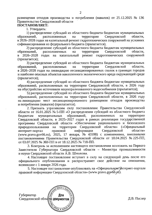 Постановление Правительства Свердловской области от 29.01.2026 N 52-ПП "О распределении субсидий из областного бюджета бюджетам муниципальных образований, расположенных на территории Свердловской области, в 2026 - 2028 годах в рамках реализации государственной программы Свердловской области "Обеспечение рационального и безопасного природопользования на территории Свердловской области"