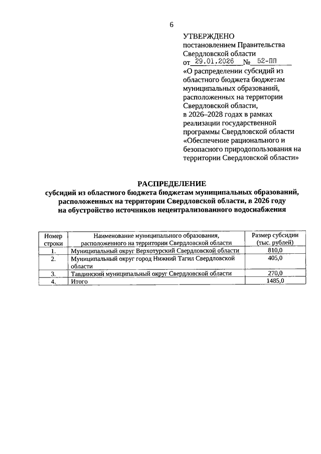 Постановление Правительства Свердловской области от 29.01.2026 N 52-ПП "О распределении субсидий из областного бюджета бюджетам муниципальных образований, расположенных на территории Свердловской области, в 2026 - 2028 годах в рамках реализации государственной программы Свердловской области "Обеспечение рационального и безопасного природопользования на территории Свердловской области"