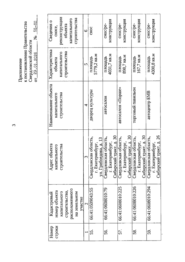 Постановление Правительства Свердловской области от 29.01.2026 N 55-ПП "О внесении изменений в адресную программу по сносу, реконструкции объектов капитального строительства (за исключением многоквартирных домов), расположенных на земельных участках, находящихся в границах застроенной территории, в отношении которой осуществляется комплексное развитие территории нежилой застройки на территории Свердловской области, утвержденную Постановлением Правительства Свердловской области от 02.09.2022 N 603-ПП"