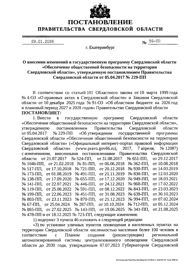 Постановление Правительства Свердловской области от 29.01.2026 N 59-ПП "О внесении изменений в государственную программу Свердловской области "Обеспечение общественной безопасности на территории Свердловской области", утвержденную Постановлением Правительства Свердловской области от 05.04.2017 N 229-ПП"