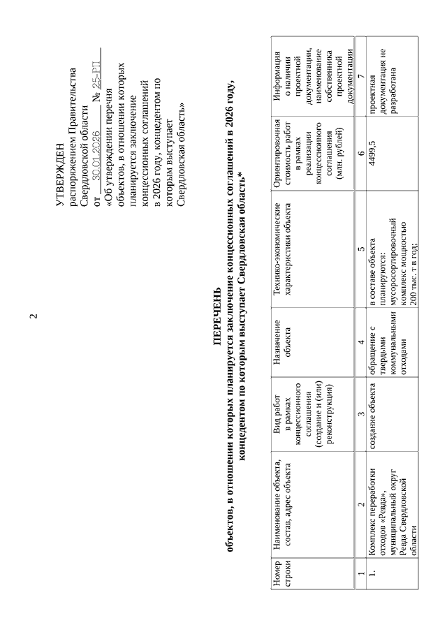 Распоряжение Правительства Свердловской области от 30.01.2026 N 25-РП "Об утверждении перечня объектов, в отношении которых планируется заключение концессионных соглашений в 2026 году, концедентом по которым выступает Свердловская область"