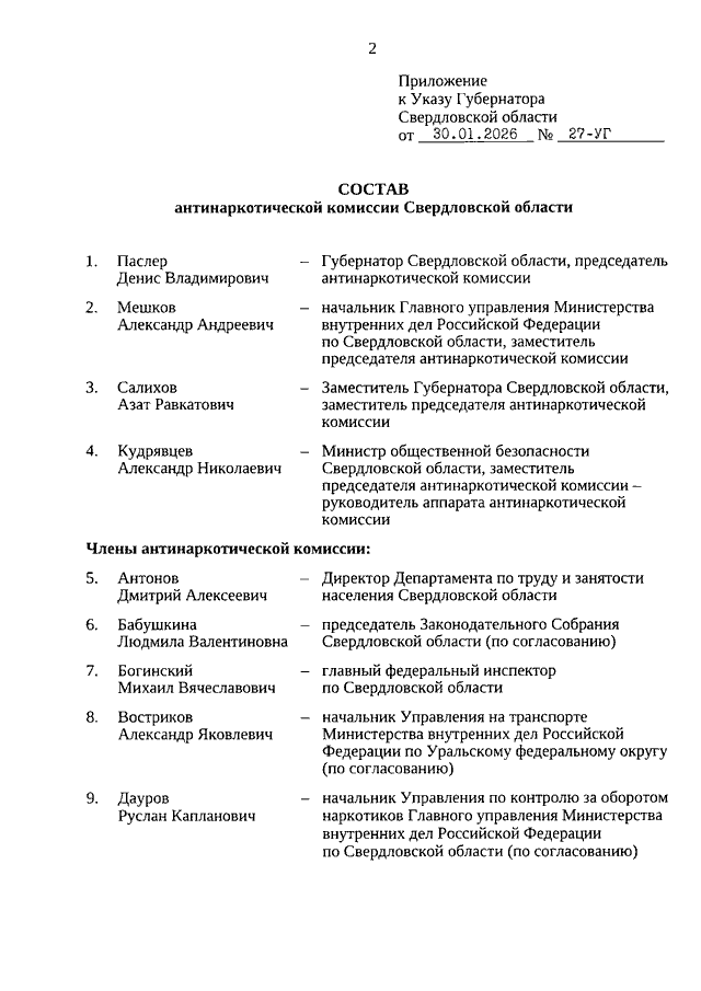 Указ Губернатора Свердловской области от 30.01.2026 N 27-УГ "О внесении изменений в состав антинаркотической комиссии Свердловской области, утвержденный Указом Губернатора Свердловской области от 16.11.2007 N 1181-УГ"