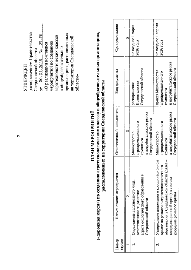 Распоряжение Правительства Свердловской области от 30.01.2026 N 27-РП "О реализации комплекса мероприятий по созданию агротехнологических классов в общеобразовательных организациях, расположенных на территории Свердловской области" (вместе с "Планом мероприятий ("дорожная карта") по созданию агротехнологических классов в общеобразовательных организациях, расположенных на территории Свердловской области")