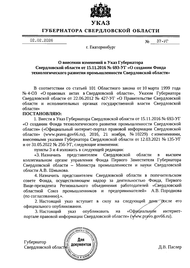 Указ Губернатора Свердловской области от 02.02.2026 N 37-УГ "О внесении изменений в Указ Губернатора Свердловской области от 15.11.2016 N 693-УГ "О создании Фонда технологического развития промышленности Свердловской области"