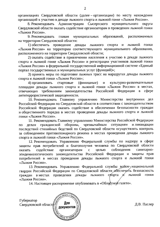 Распоряжение Губернатора Свердловской области от 02.02.2026 N 17-РГ "О подготовке и проведении на территории Свердловской области декады лыжного спорта и XLIV открытой Всероссийской массовой лыжной гонки "Лыжня России"