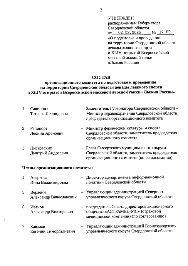 Распоряжение Губернатора Свердловской области от 02.02.2026 N 17-РГ "О подготовке и проведении на территории Свердловской области декады лыжного спорта и XLIV открытой Всероссийской массовой лыжной гонки "Лыжня России"