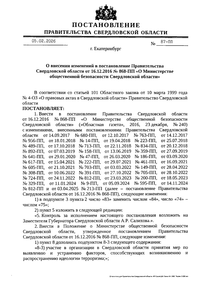Постановление Правительства Свердловской области от 05.02.2026 N 87-ПП "О внесении изменений в Постановление Правительства Свердловской области от 16.12.2016 N 868-ПП "О Министерстве общественной безопасности Свердловской области"