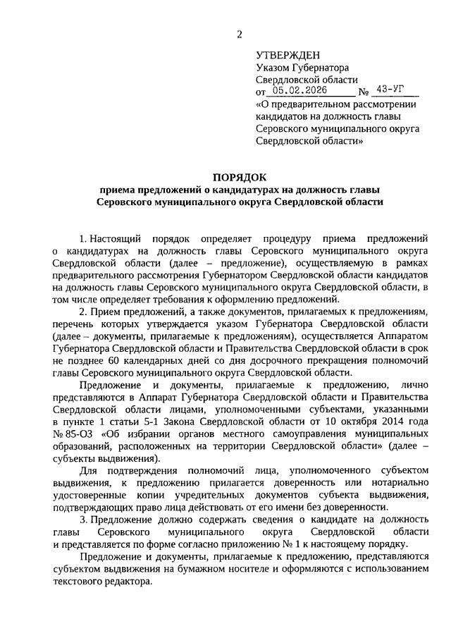 Указ Губернатора Свердловской области от 05.02.2026 N 43-УГ "О предварительном рассмотрении кандидатов на должность главы Серовского муниципального округа Свердловской области" (вместе с "Порядком приема предложений о кандидатурах на должность главы Серовского муниципального округа Свердловской области", "Перечнем документов, прилагаемых к предложениям о кандидатурах на должность главы Серовского муниципального округа Свердловской области", "Порядком деятельности Комиссии по рассмотрению кандидатур на должность главы Серовского муниципального округа Свердловской области")