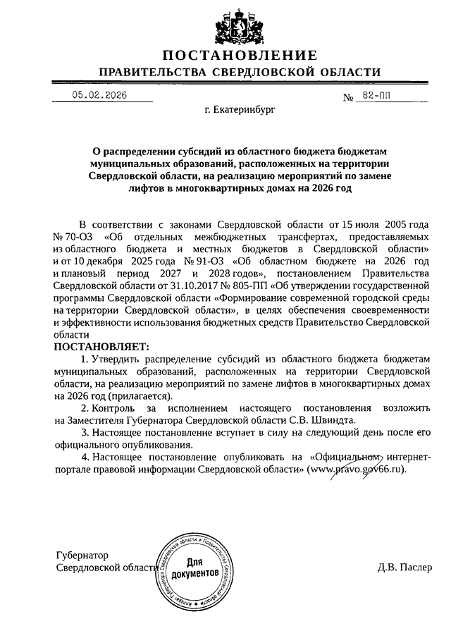 Постановление Правительства Свердловской области от 05.02.2026 N 82-ПП "О распределении субсидий из областного бюджета бюджетам муниципальных образований, расположенных на территории Свердловской области, на реализацию мероприятий по замене лифтов в многоквартирных домах на 2026 год"