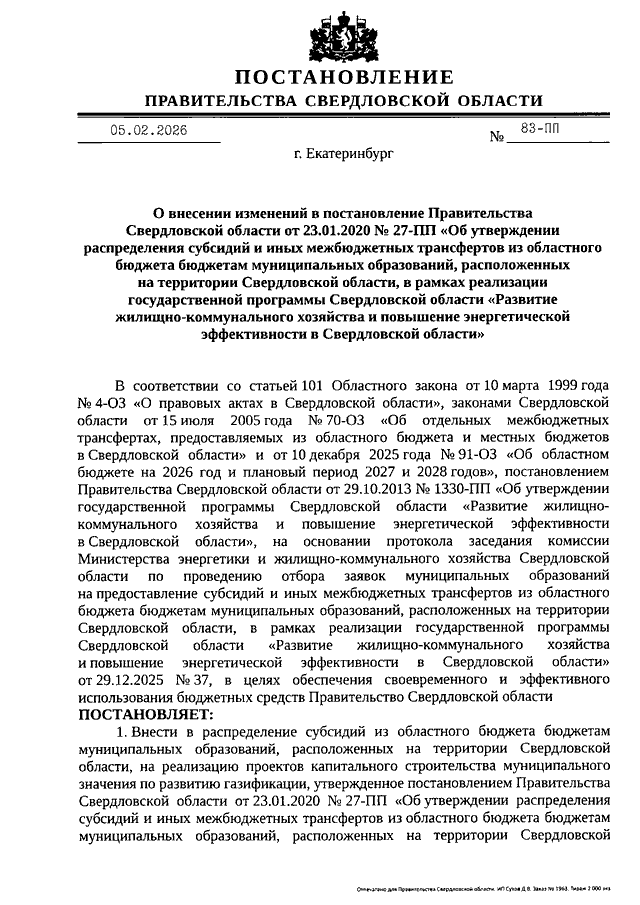 Постановление Правительства Свердловской области от 05.02.2026 N 83-ПП "О внесении изменений в Постановление Правительства Свердловской области от 23.01.2020 N 27-ПП "Об утверждении распределения субсидий и иных межбюджетных трансфертов из областного бюджета бюджетам муниципальных образований, расположенных на территории Свердловской области, в рамках реализации государственной программы Свердловской области "Развитие жилищно-коммунального хозяйства и повышение энергетической эффективности в Свердловской области"