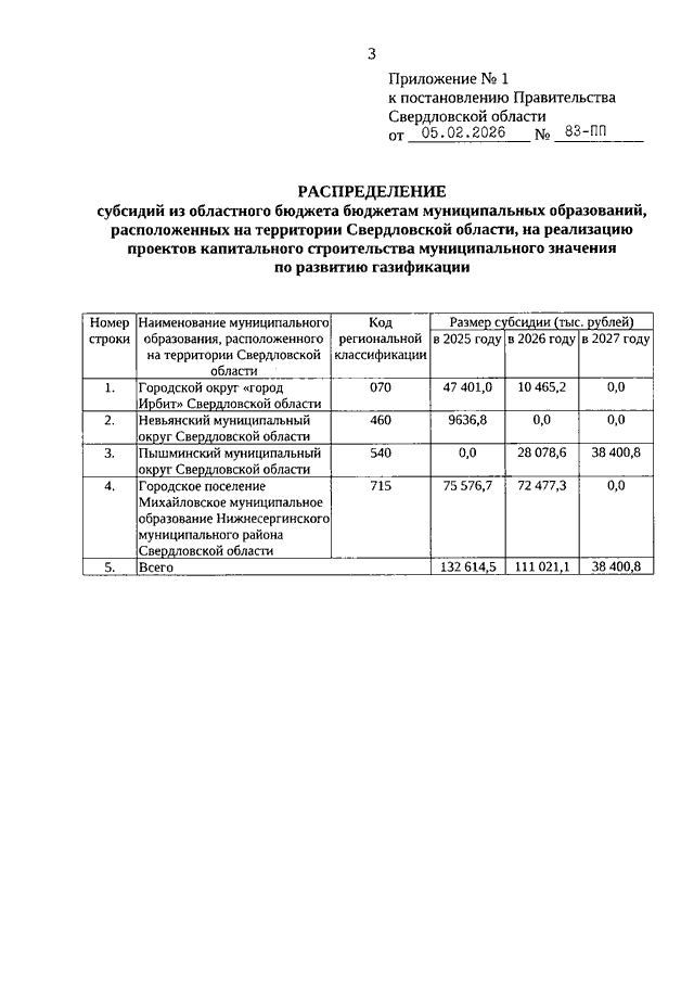 Постановление Правительства Свердловской области от 05.02.2026 N 83-ПП "О внесении изменений в Постановление Правительства Свердловской области от 23.01.2020 N 27-ПП "Об утверждении распределения субсидий и иных межбюджетных трансфертов из областного бюджета бюджетам муниципальных образований, расположенных на территории Свердловской области, в рамках реализации государственной программы Свердловской области "Развитие жилищно-коммунального хозяйства и повышение энергетической эффективности в Свердловской области"