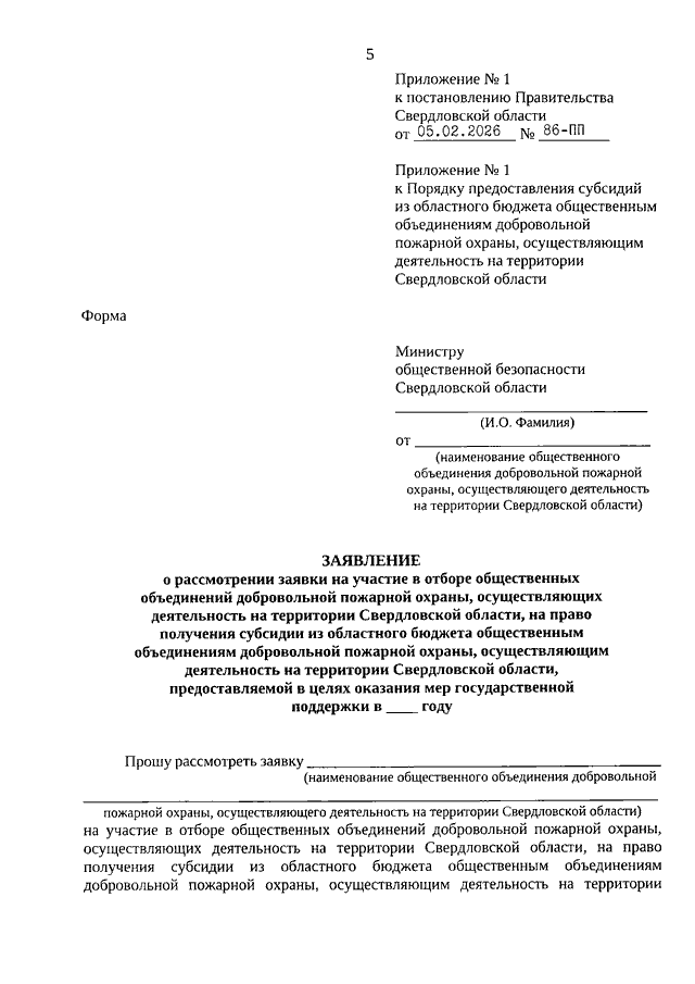 Постановление Правительства Свердловской области от 05.02.2026 N 86-ПП "О внесении изменений в Постановление Правительства Свердловской области от 10.06.2021 N 321-ПП "Об утверждении Порядка предоставления субсидий из областного бюджета общественным объединениям добровольной пожарной охраны, осуществляющим деятельность на территории Свердловской области, и Порядка предоставления субсидий из областного бюджета общественным объединениям в сфере охраны общественного порядка, осуществляющим деятельность на территории Свердловской области"