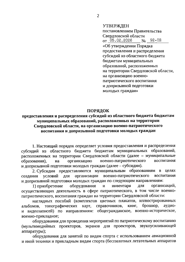Постановление Правительства Свердловской области от 05.02.2026 N 92-ПП "Об утверждении Порядка предоставления и распределения субсидий из областного бюджета бюджетам муниципальных образований, расположенных на территории Свердловской области, на организацию военно-патриотического воспитания и допризывной подготовки молодых граждан"