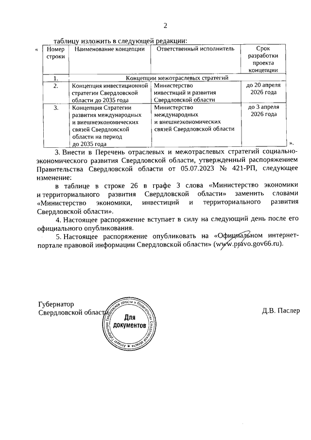 Распоряжение Правительства Свердловской области от 12.02.2026 N 50-РП "О внесении изменений в Распоряжение Правительства Свердловской области от 05.07.2023 N 421-РП "Об утверждении Перечня концепций отраслевых и межотраслевых стратегий социально-экономического развития Свердловской области и Перечня отраслевых и межотраслевых стратегий социально-экономического развития Свердловской области"