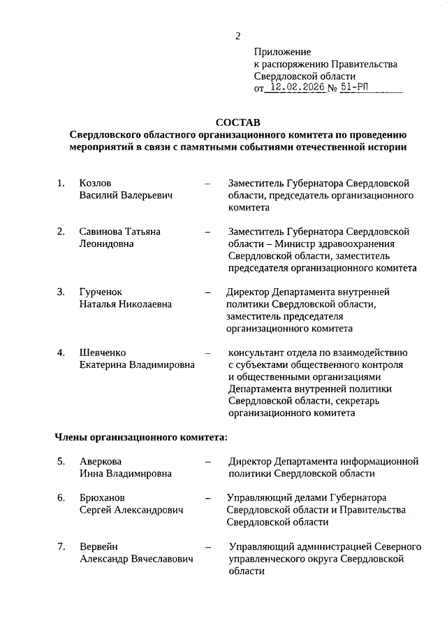 Распоряжение Правительства Свердловской области от 12.02.2026 N 51-РП "О внесении изменений в Распоряжение Правительства Свердловской области от 18.10.2024 N 660-РП "Об утверждении состава Свердловского областного организационного комитета по проведению мероприятий в связи с памятными событиями отечественной истории"