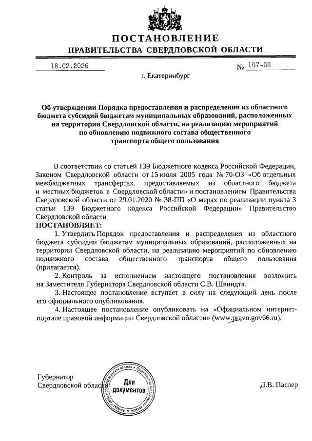 Постановление Правительства Свердловской области от 18.02.2026 N 107-ПП "Об утверждении Порядка предоставления и распределения из областного бюджета субсидий бюджетам муниципальных образований, расположенных на территории Свердловской области, на реализацию мероприятий по обновлению подвижного состава общественного транспорта общего пользования"