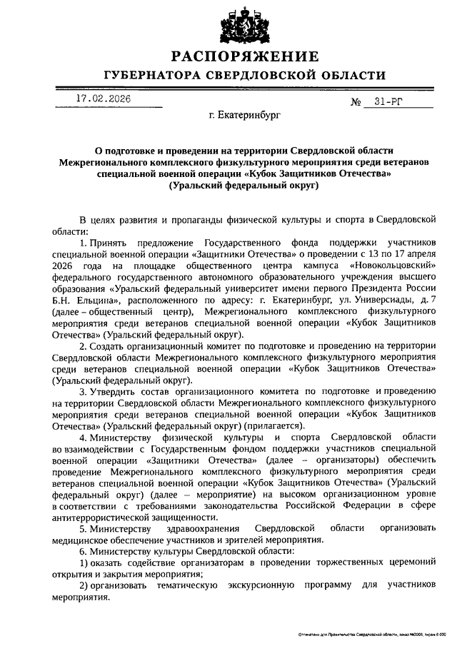 Распоряжение Губернатора Свердловской области от 17.02.2026 N 31-РГ "О подготовке и проведении на территории Свердловской области Межрегионального комплексного физкультурного мероприятия среди ветеранов специальной военной операции "Кубок Защитников Отечества" (Уральский федеральный округ)"
