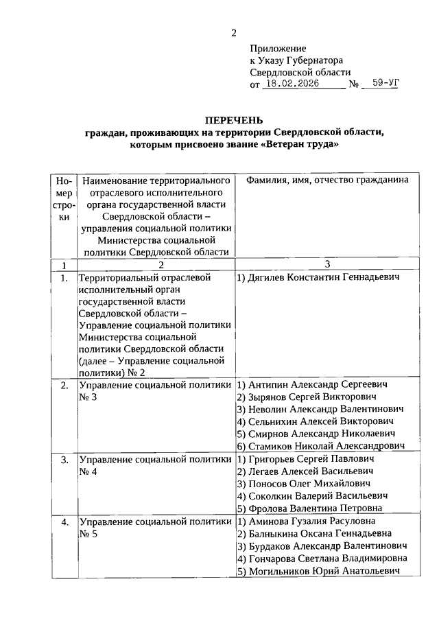 Указ Губернатора Свердловской области от 18.02.2026 N 59-УГ "О присвоении звания "Ветеран труда"